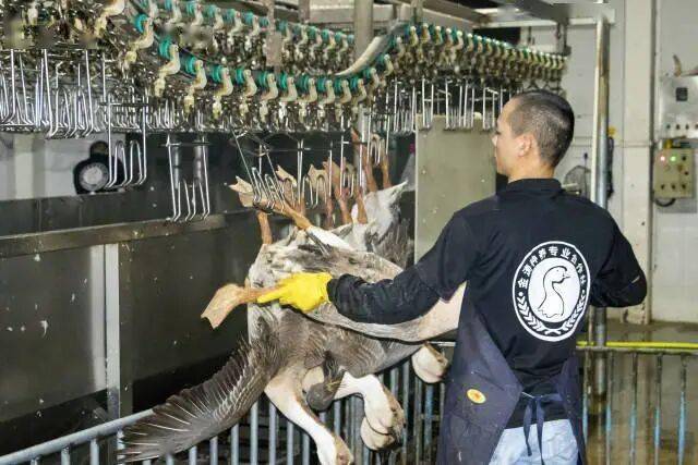 一只只壮硕的狮头鹅经规范屠宰后,被送上自动化流水线,脱毛、清洗、分切……天微微亮时,满载鹅肉的冷链车已驶出大门,奔赴粤港澳大湾区大小市场。